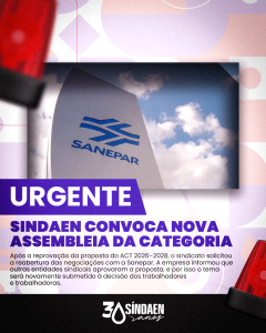 Já é de conhecimento de todos que a data base do Sindaen e demais sindicatos da Sanepar é o mês de março. O ACT vence em 28 de fevereiro. Por deliberação e luta dos trabalhadores foi rejeitada a proposta da Sanepar, realizada greve e recorrido ao MPT que encaminhou para dissídio junto ao Saemac. Enquanto isto a Sanepar está praticando o ACT anterior, prova disto é o salário que recebemos mensalmente, pagamento do benefício da gratificação de férias de meio piso inicial do nível médio, etc. Confiram perguntando para quem já gozou férias após fevereiro.