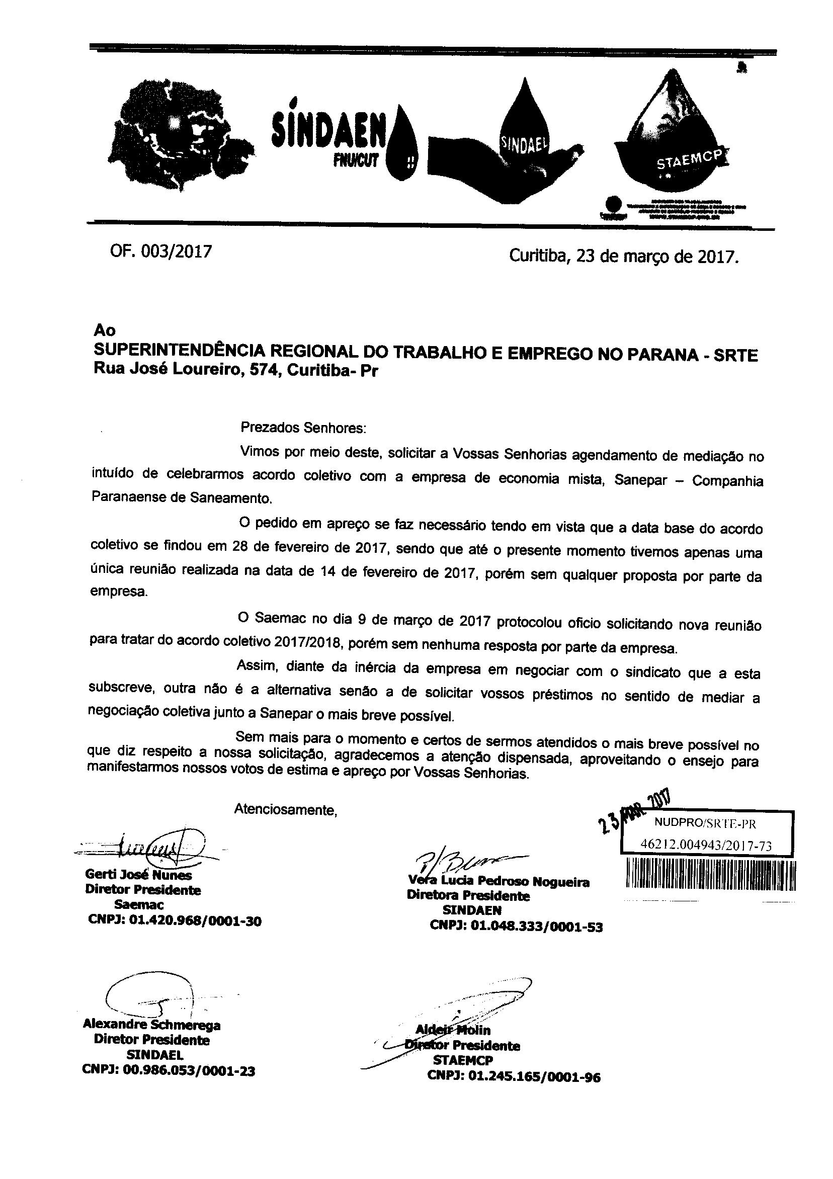 Abaixo temos o ofício enviado à Sanepar e outro protocolado na Superintendência Regional do Trabalho e Emprego no Paraná.