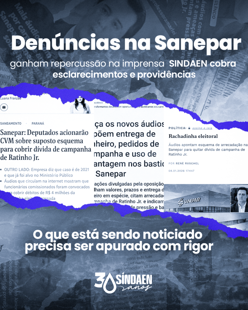 Reunião de informações institucionais e matérias jornalísticas para fins de protocolo O Sindicato dos Trabalhadores no Saneamento do Paraná – SINDAEN vem a público manifestar preocupação institucional diante da gravidade das denúncias que vêm sendo amplamente divulgadas pela imprensa estadual e nacional envolvendo a Companhia de Saneamento do Paraná (Sanepar), autoridades públicas e possíveis irregularidades […]